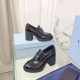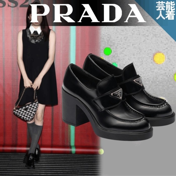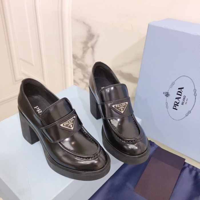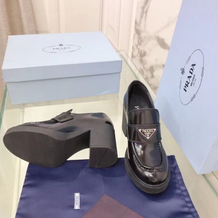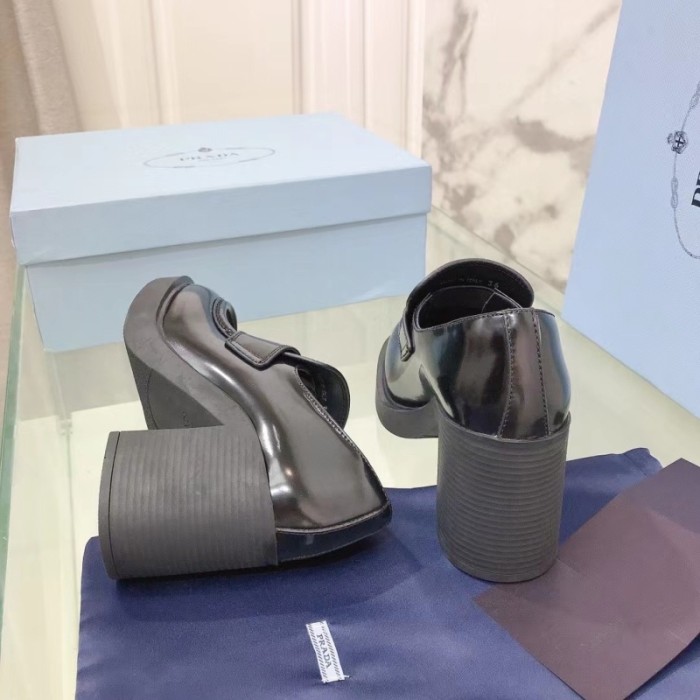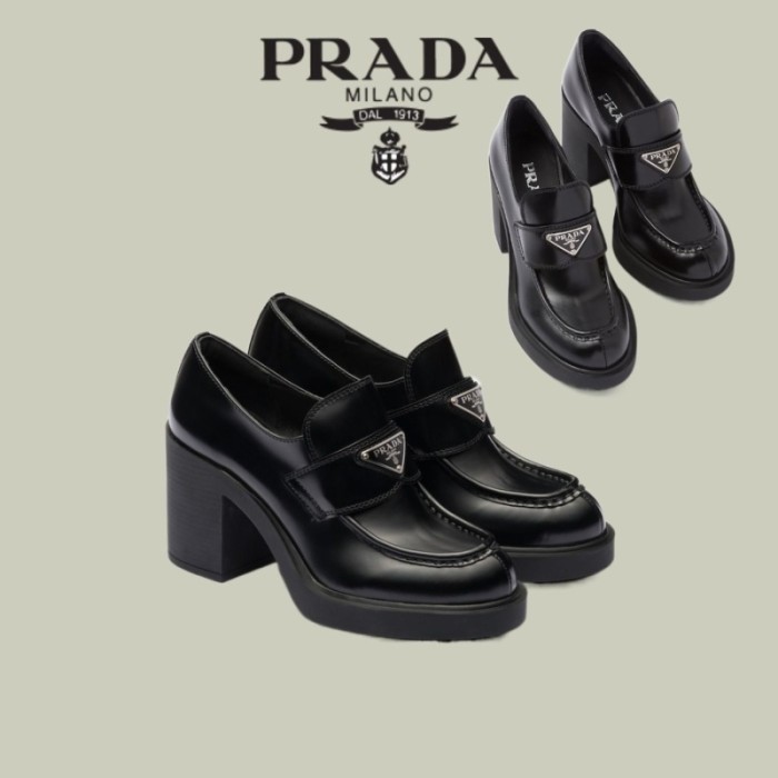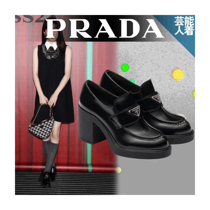 프라다 초콜릿 하이힐 브러쉬드 로퍼 블랙