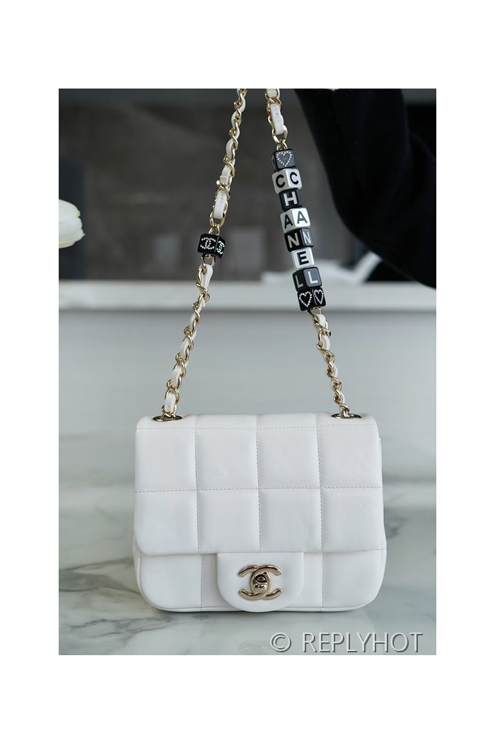 [하이엔드급] 샤넬 로고 레진 참 미니 플랩백 램스킨 골드메탈 화이트 [매장가 650만원대] > CHANEL