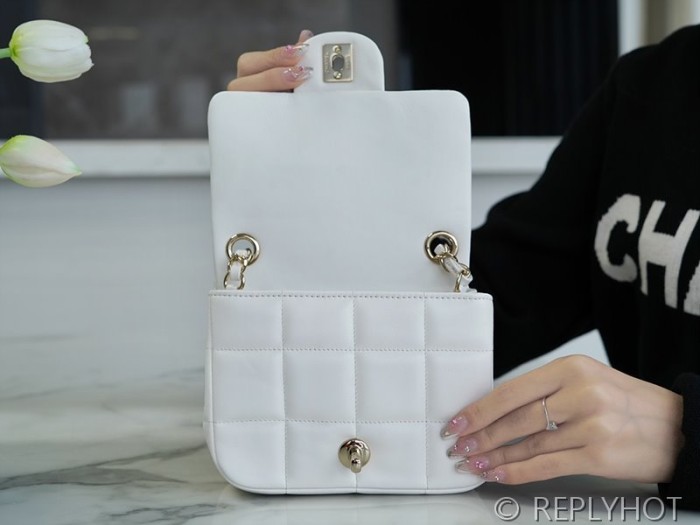 • [하이엔드급] 샤넬 로고 레진 참 미니 플랩백 램스킨 골드메탈 화이트 [매장가 650만원대]