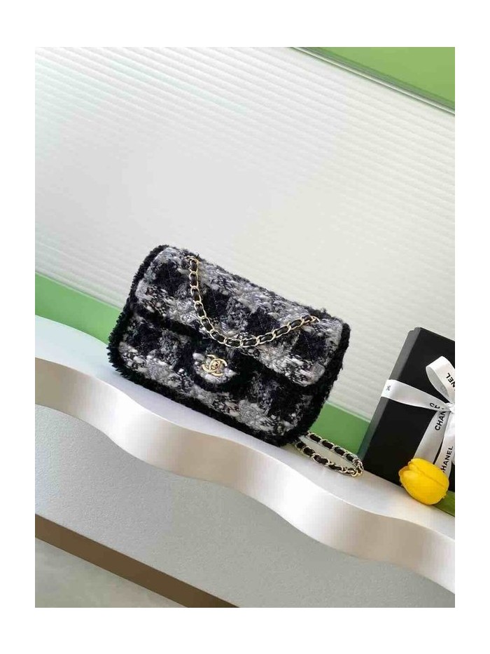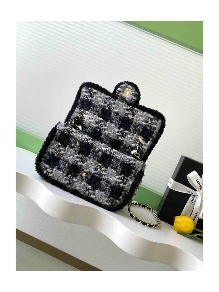 • Chanel 25N Coco Neige Tweed Classic Flap Bag Black White Tweed GHW 26cm