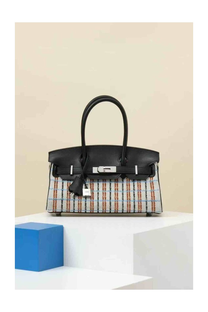 HERMÈS Birkin Shoulder Light 29 Noir (89) Ecru Swift Toile H canvas x Palladium hardware