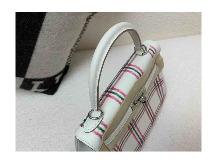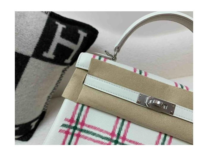 HermèsKelly 25 Painted Checkered Swift (Pink & Green on White) x Palladium Hardware > Kelly25