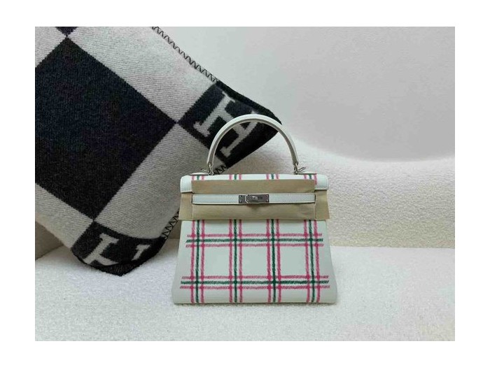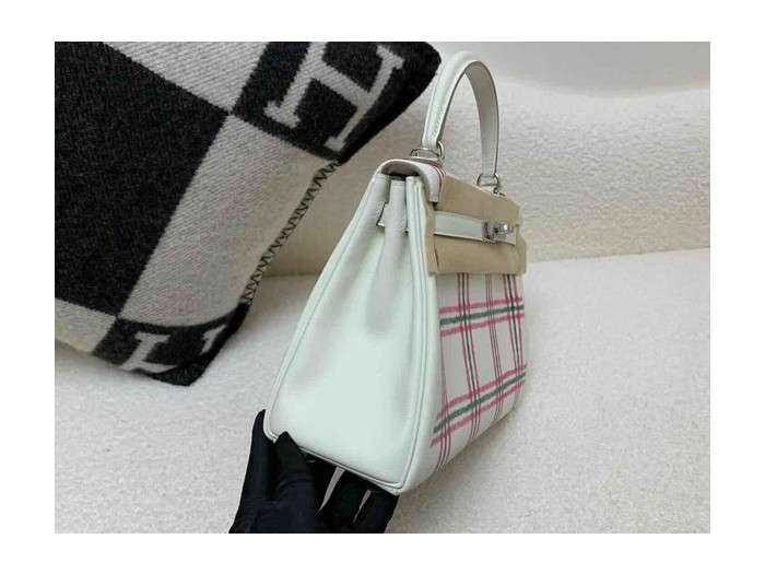 • HermèsKelly 25 Painted Checkered Swift (Pink & Green on White) x Palladium Hardware