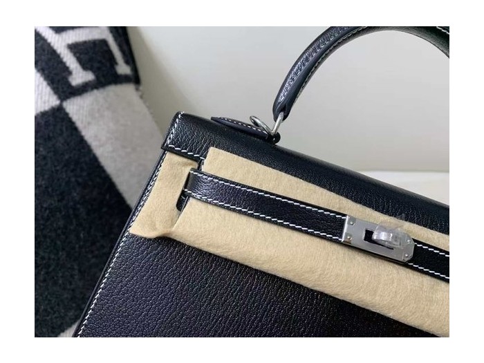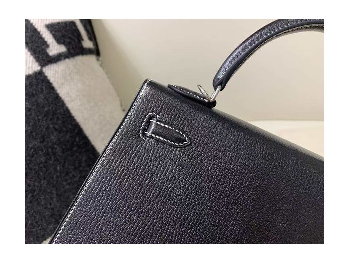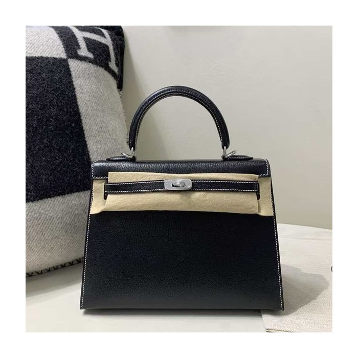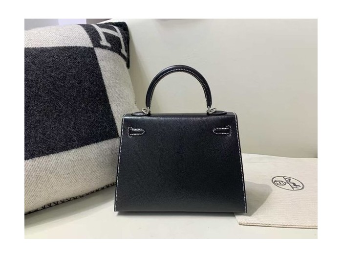 Hermès Kelly 25 Sellier Evercolor Noir / White Stitch x Palladium Hardware > Kelly25