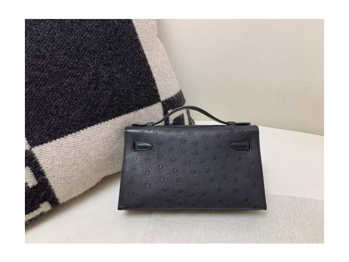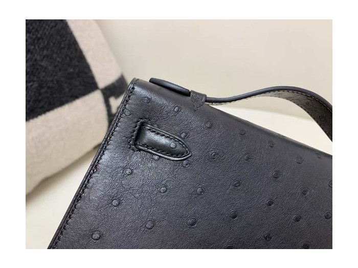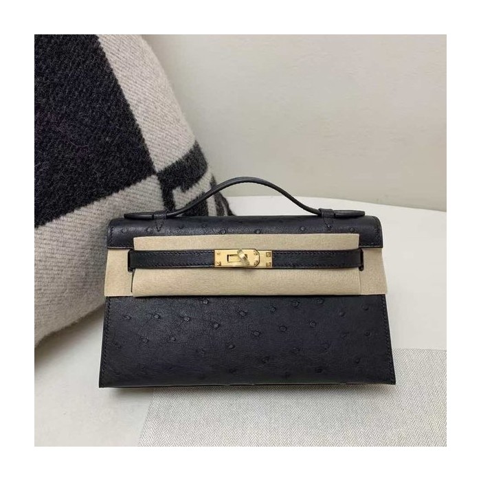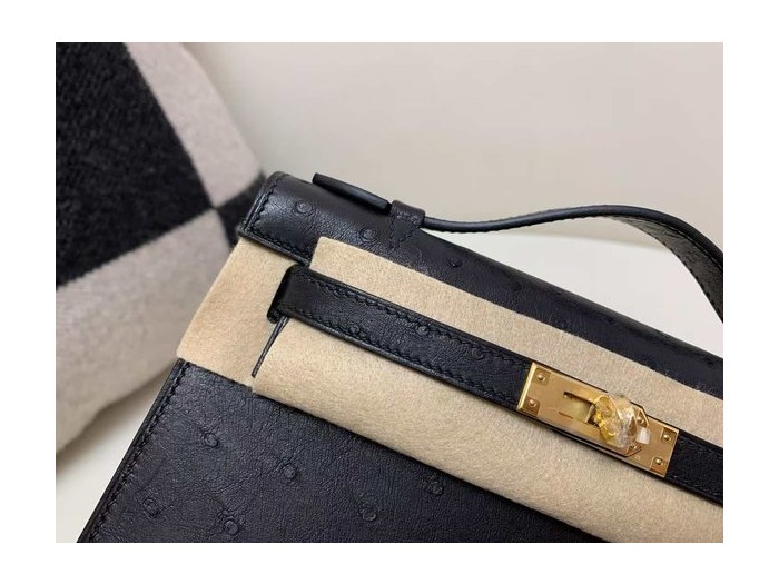 Hermès Kelly Pochette Ostrich Noir x Gold Hardware > Ostrich