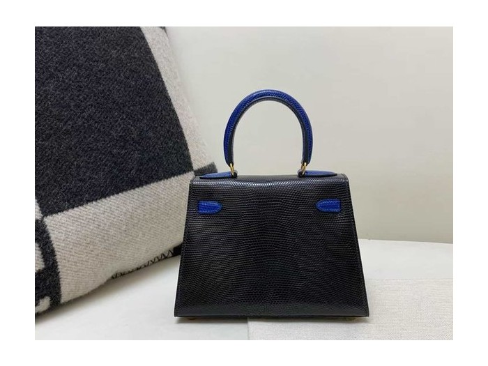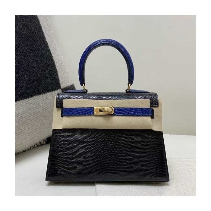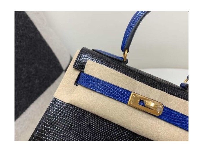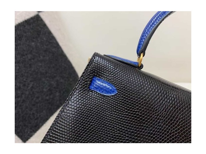 Hermès Mini Kelly 20 Big Lizard Noir with Sapphire Blue x Gold Hardware > Lizard
