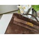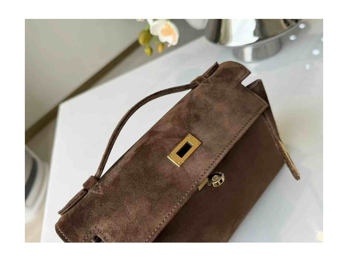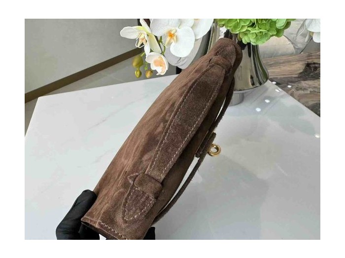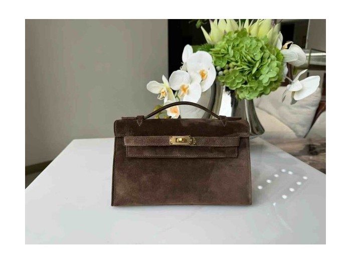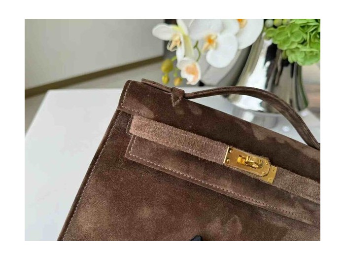 • Hermès Kelly Pochette Suede Dark Brown x Gold Hardware