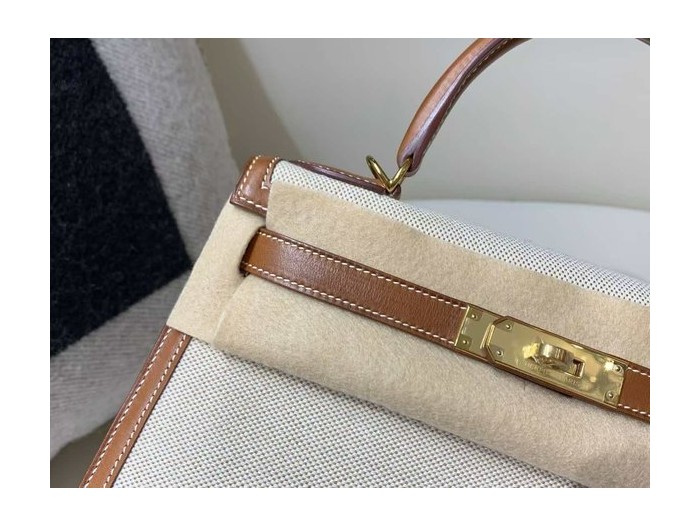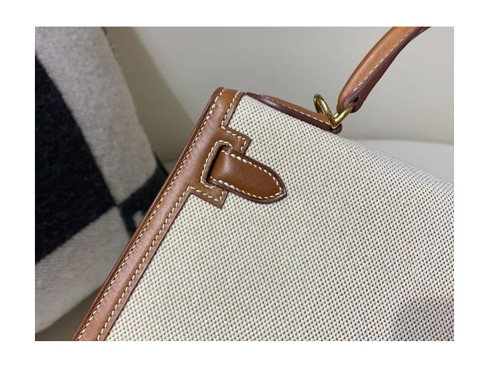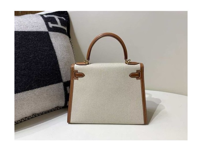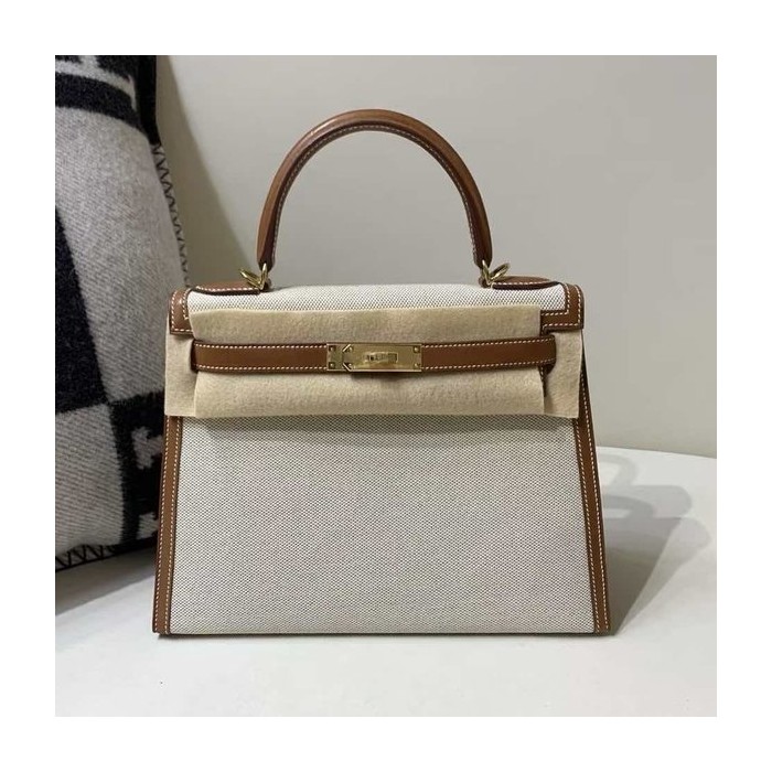 • Hermès Kelly 25 Sellier in Toile and Barenia Faubourg Leather, Gold Hardware