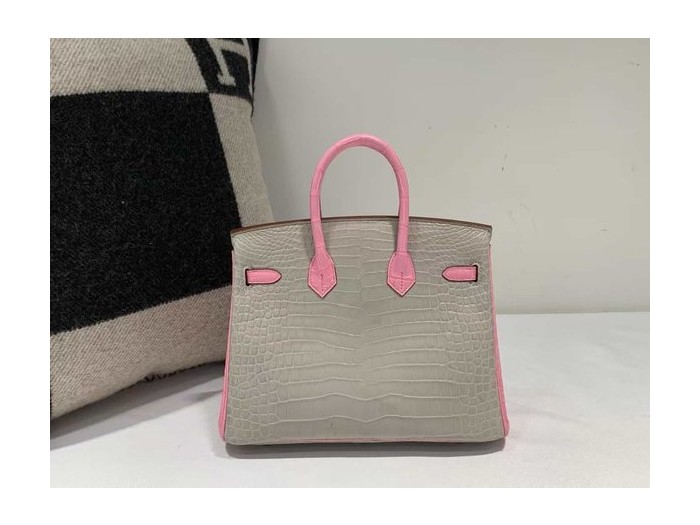 • Hermès Birkin 25 Gris Perle and Rose Sakura Matte Alligator x palladium hardware