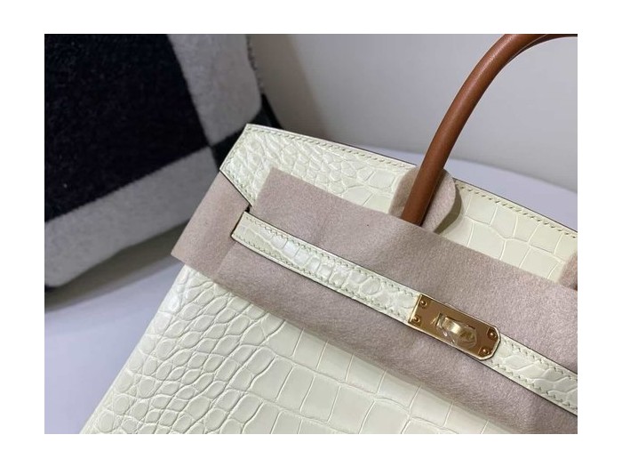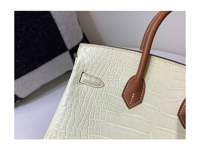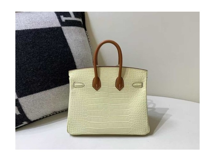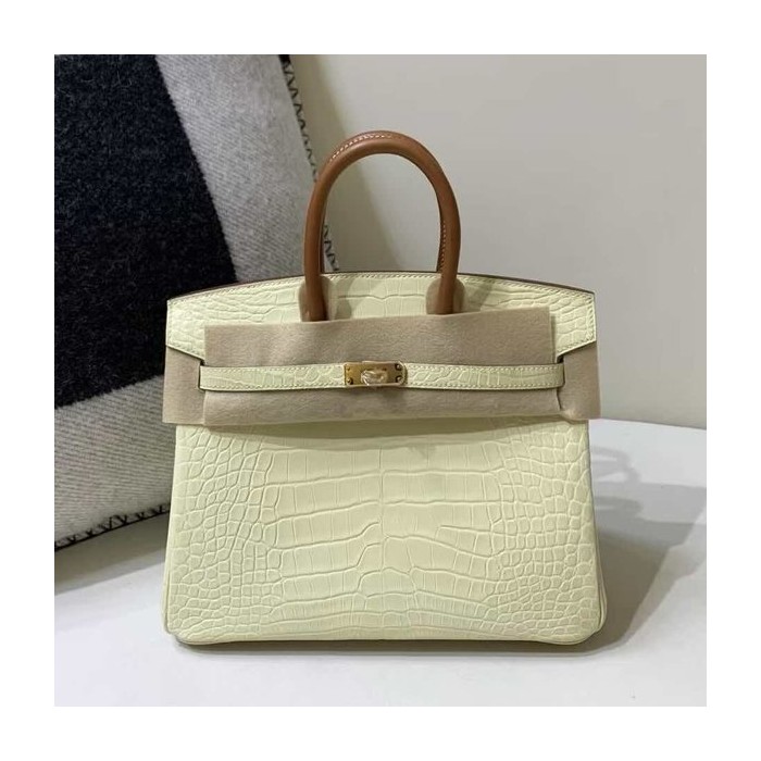 • Hermès Birkin 25 Jaune Poussin Matte Niloticus Crocodile & Gold Leather Handle x Gold Hardware