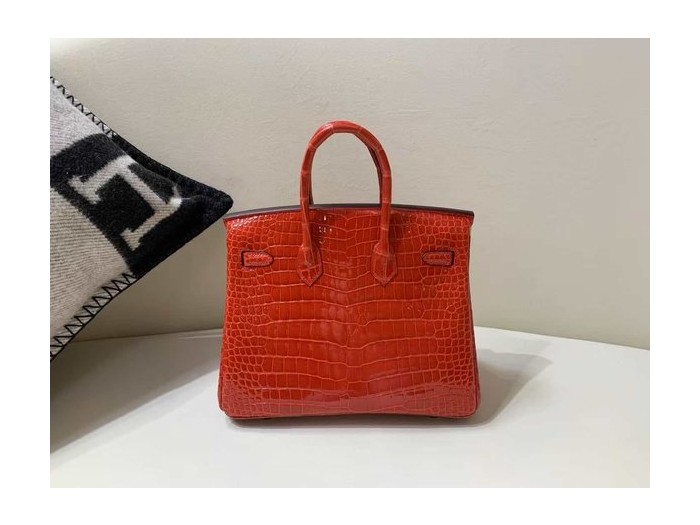 • Hermès Birkin 25 Shiny Porosus Crocodile Ferrari Red x Gold Hardware
