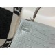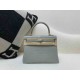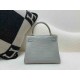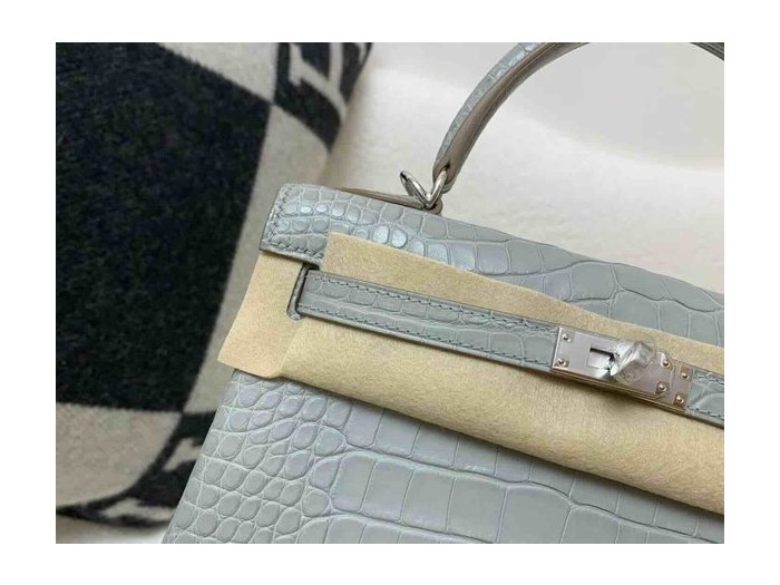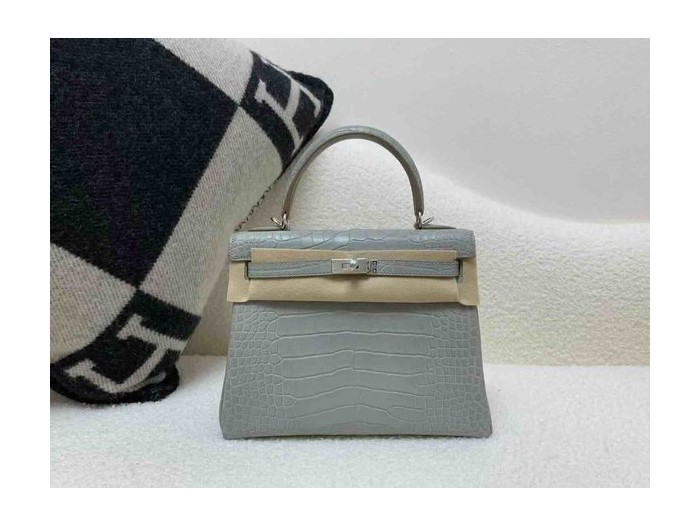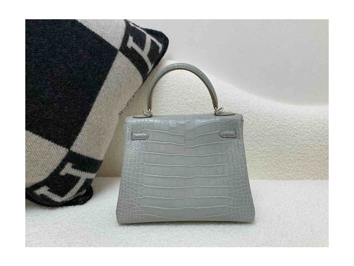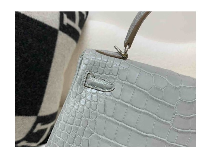 • Hermès Kelly 25 Alligator Matte Gris Perle (80 Pearl Grey) with Lemon Yellow Interior, Palladium Hardware