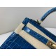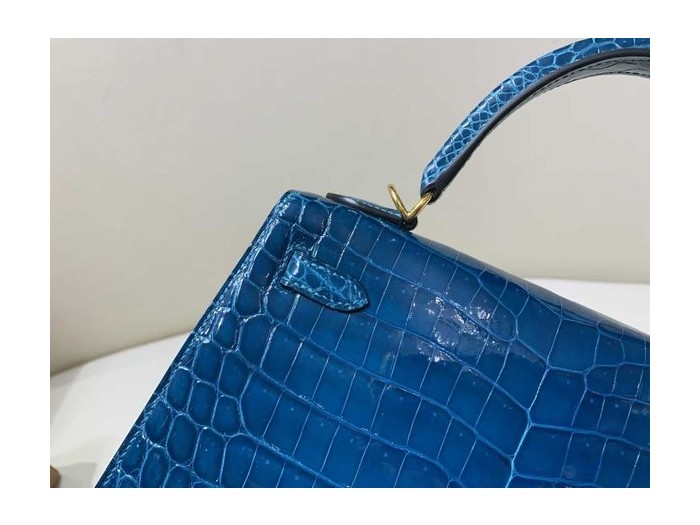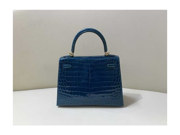 • Hermès Kelly 25 Sellier Bleu Marine Shiny Porosus Crocodile / Gold Hardware