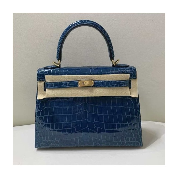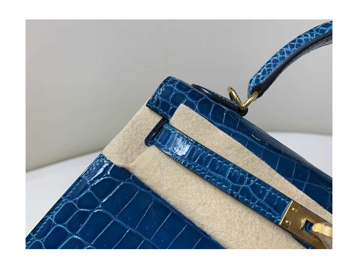 Hermès Kelly 25 Sellier Bleu Marine Shiny Porosus Crocodile / Gold Hardware