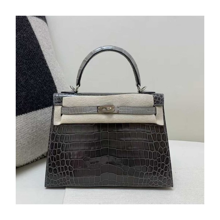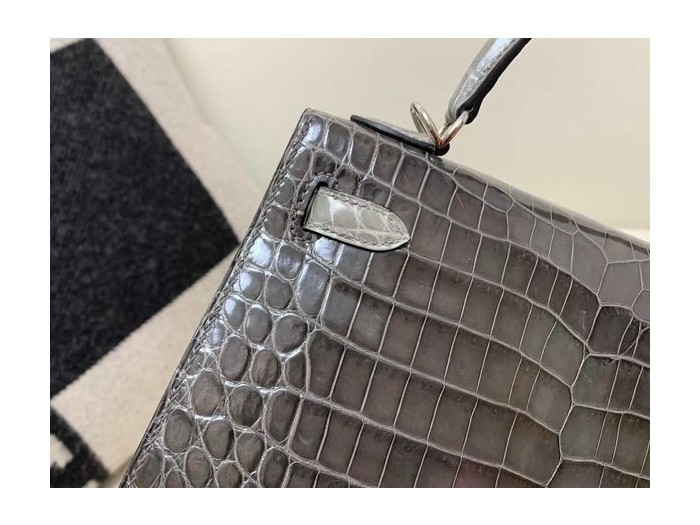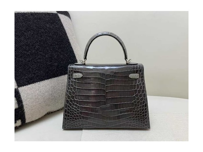 Hermès Kelly 25 Shiny Niloticus Crocodile 88 Graphite with Etoupe – Palladium Hardware > Kelly
