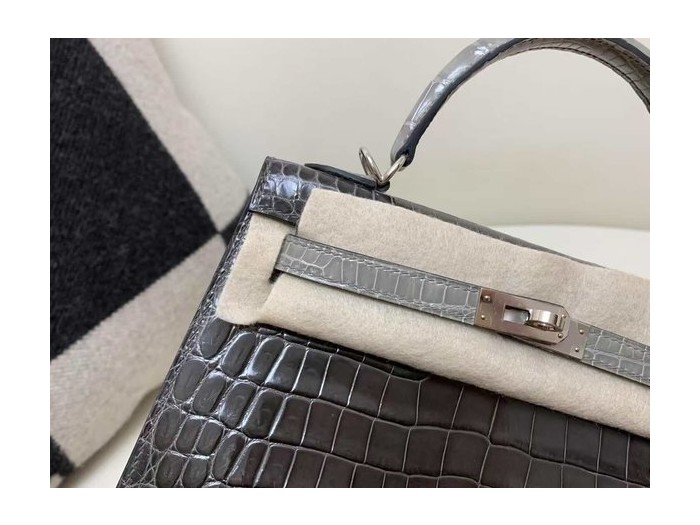 • Hermès Kelly 25 Shiny Niloticus Crocodile 88 Graphite with Etoupe – Palladium Hardware