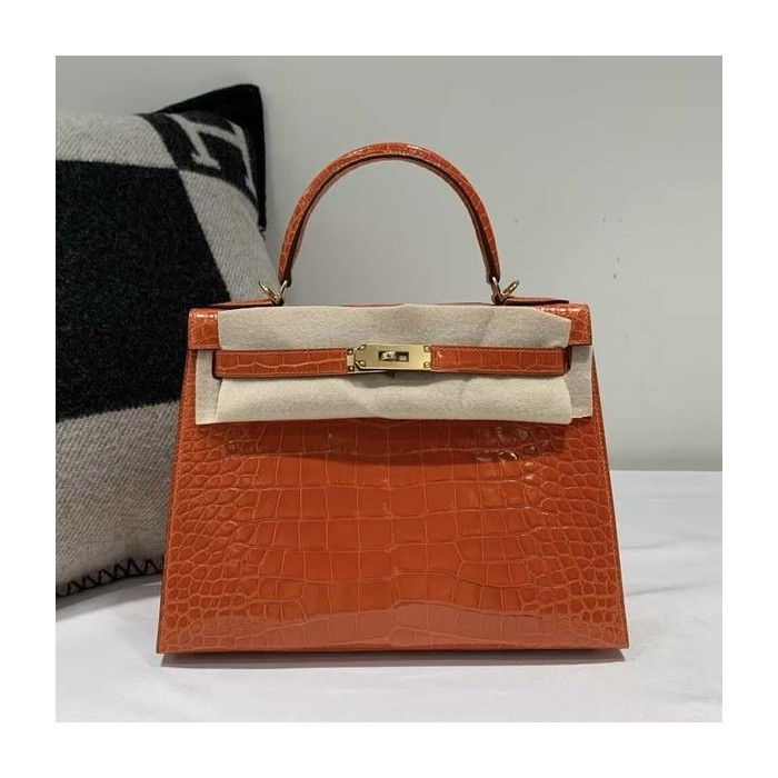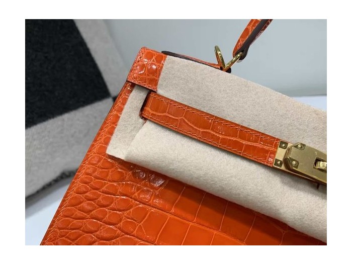 Hermès Kelly 28 Shiny American Alligator Orange – Gold Hardware > Kelly