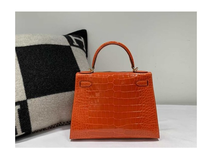 • Hermès Kelly 28 Shiny American Alligator Orange – Gold Hardware