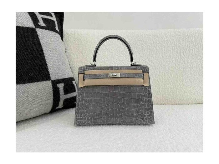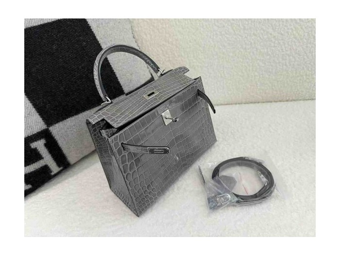 • Hermès Kelly 25 Shiny Niloticus Crocodile Crystal Grey x Palladium Hardware