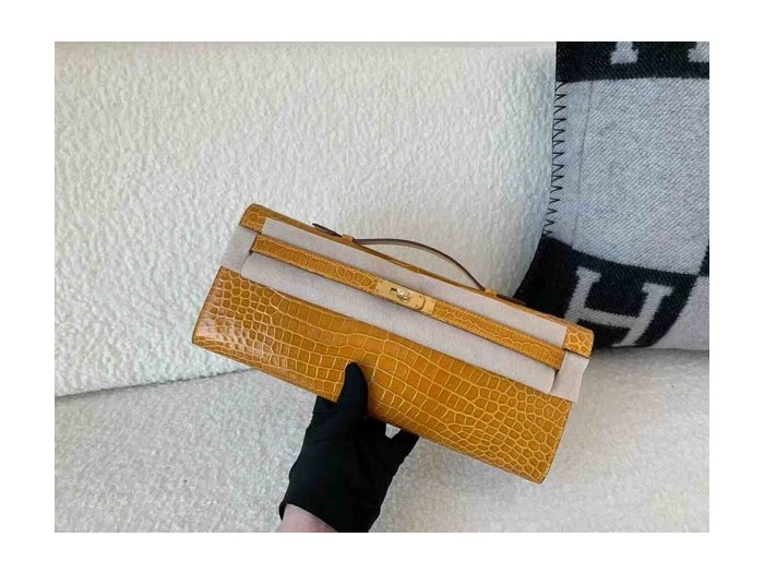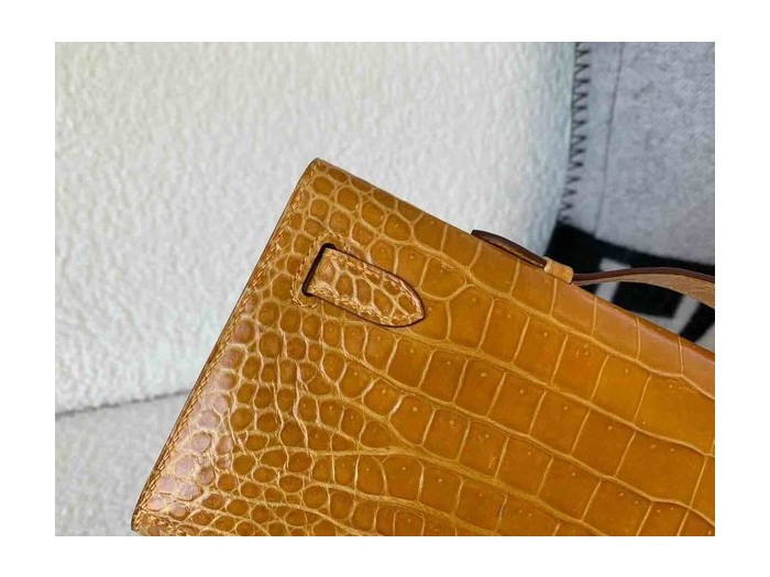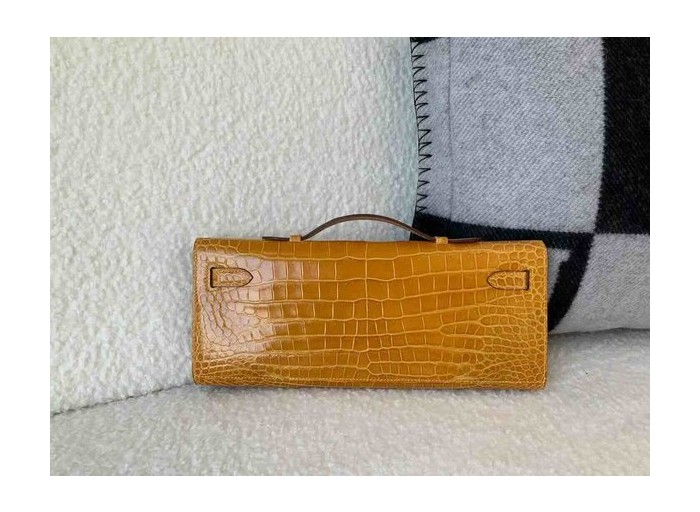Hermès Kelly Cut 31 Shiny Porosus Crocodile Amber (Gold Family) x Gold Hardware > Kelly Cut