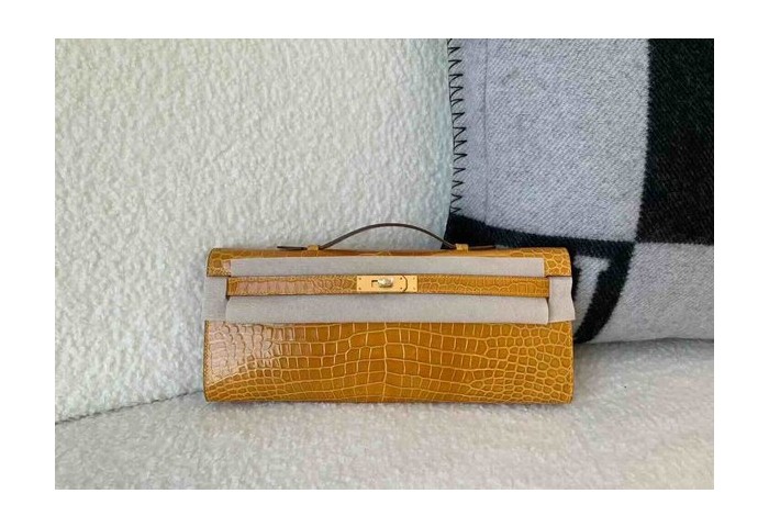 Hermès Kelly Cut 31 Shiny Porosus Crocodile Amber (Gold Family) x Gold Hardware