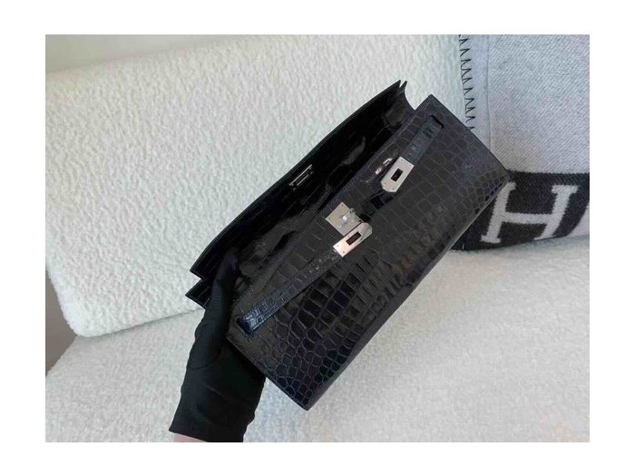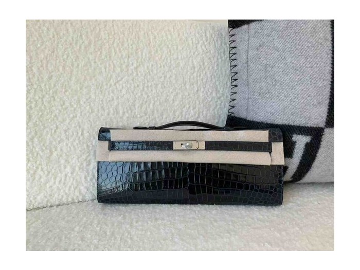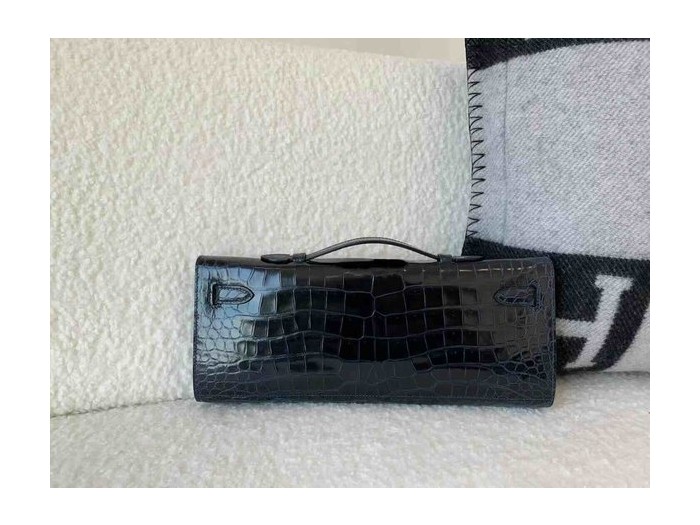 Hermès Kelly Cut 31 Shiny Porosus Crocodile Bleu Nuit x Palladium Hardware > Kelly Cut