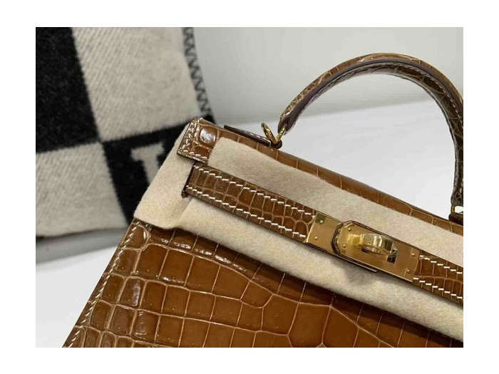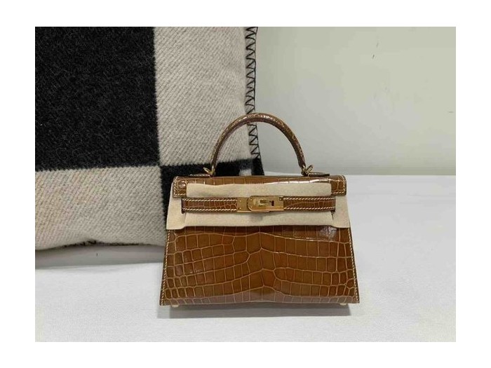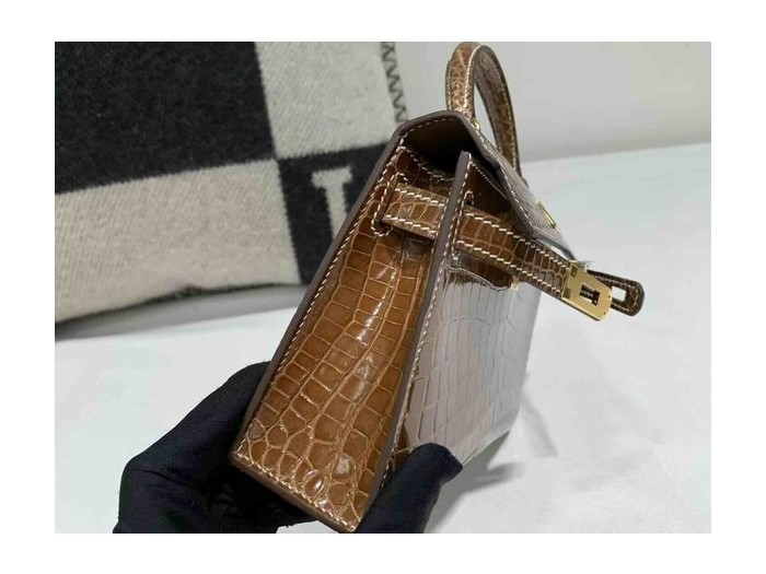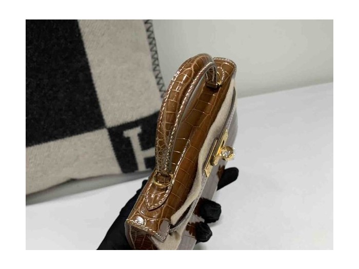 Hermès Mini Kelly II Shiny Alligator Tobacco Grey x Gold Hardware > Mini Kelly