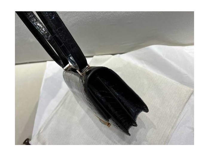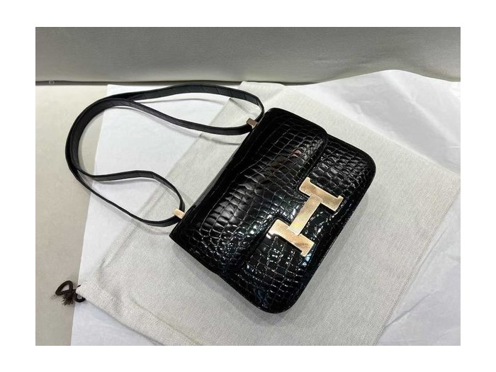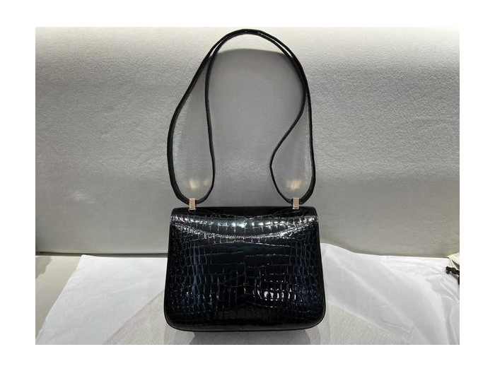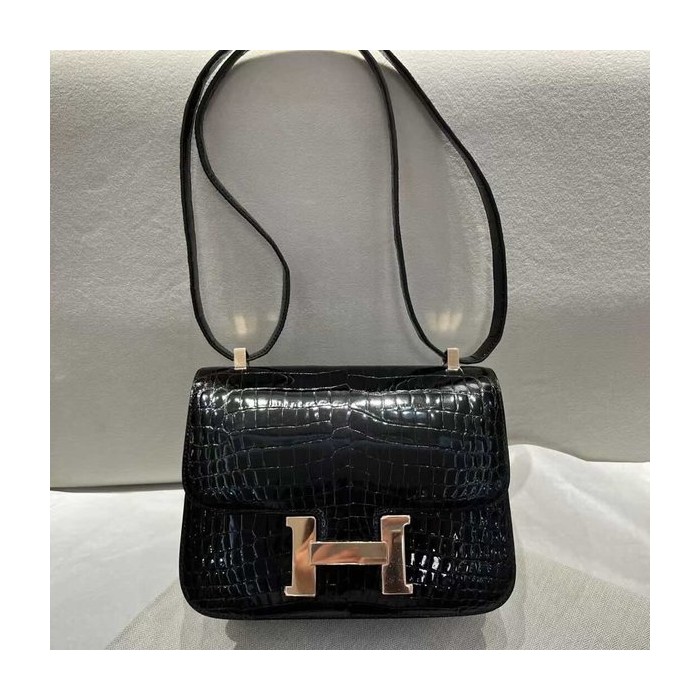 • Hermès Constance 18 in Shiny Porosus Crocodile, Noir, Rose Gold Hardware