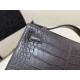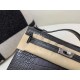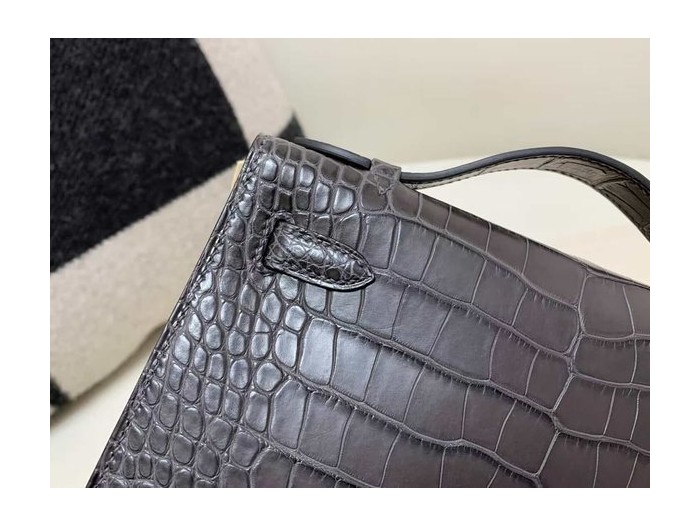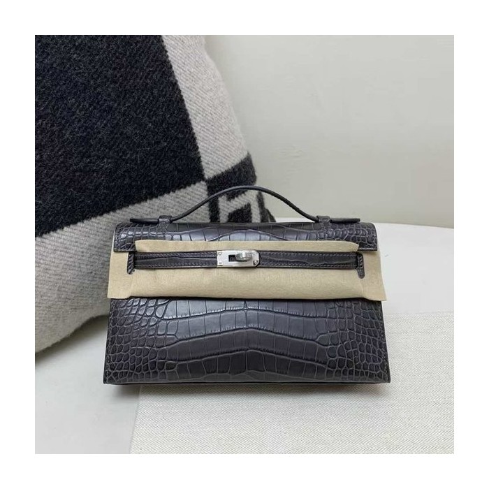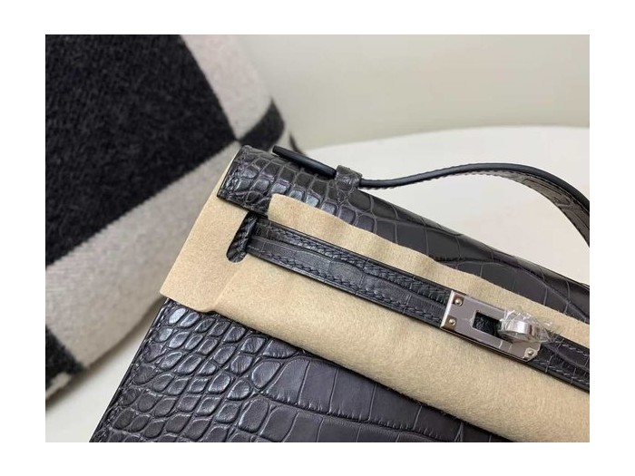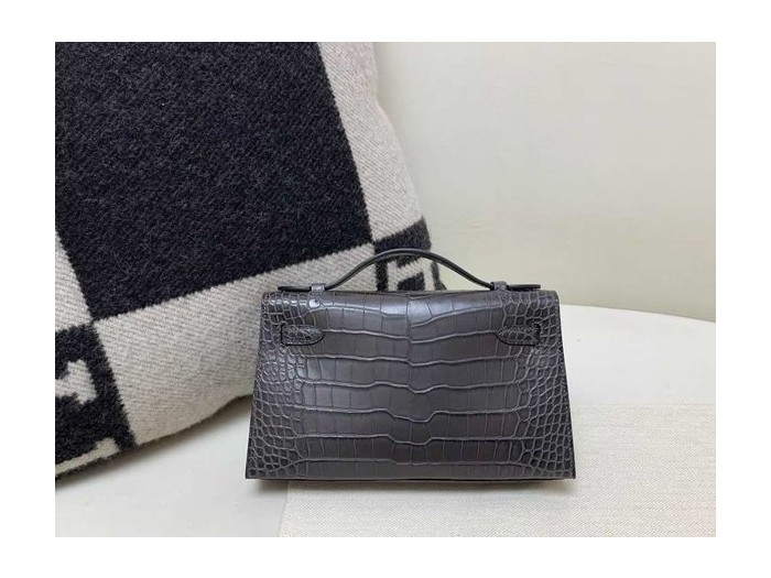 • Hermès Kelly Pochette Shiny Crocodile Graphite with Silver Hardware