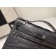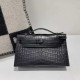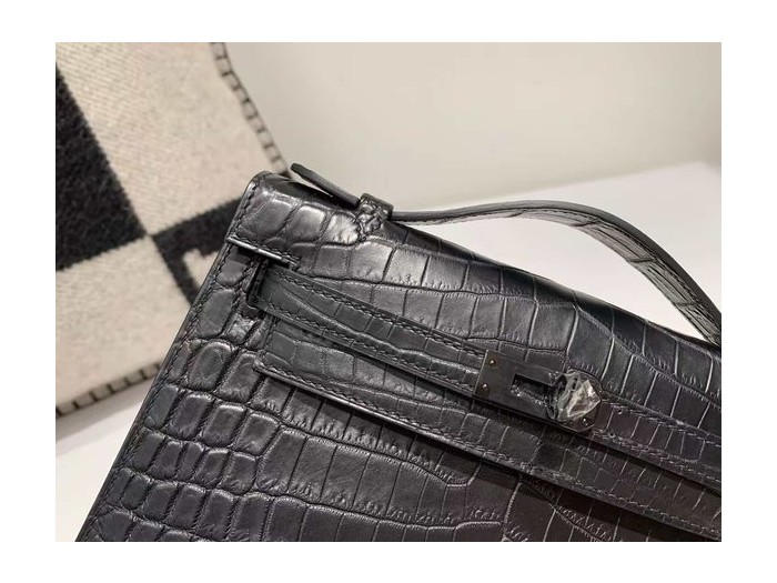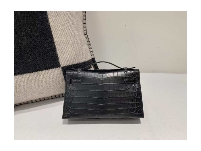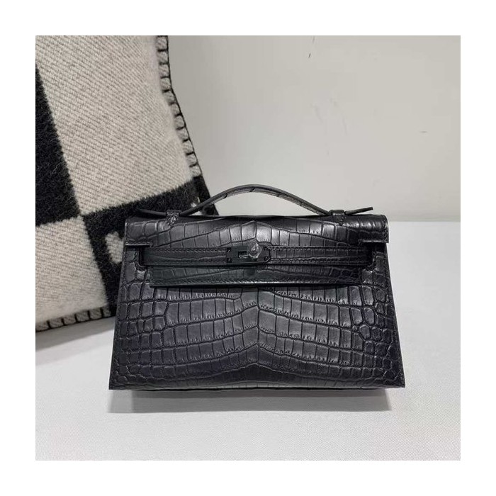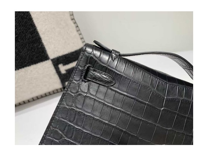 • Hermès Kelly Pochette in Shiny Black Crocodile with Black Hardware
