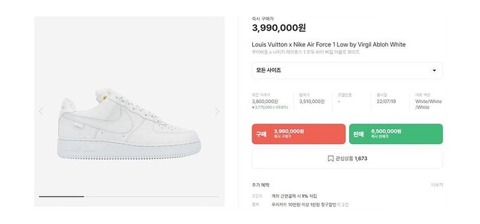 루이비통 X 나이키 에어포스 1 로우 바이 버질 아블로 화이트 [리셀가400만원대]