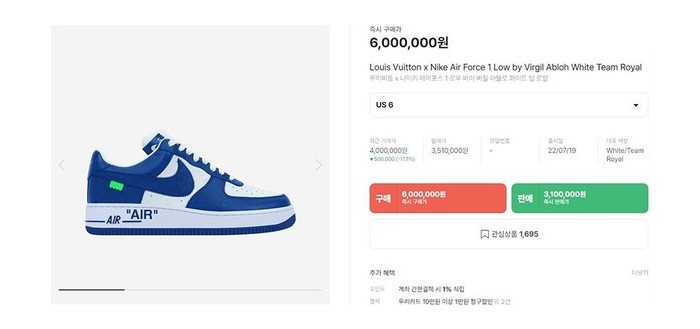 루이비통 X 나이키 에어포스 1 로우 바이 버질 아블로 화이트 팀 로얄 [리셀가600만원대] > 루이비통