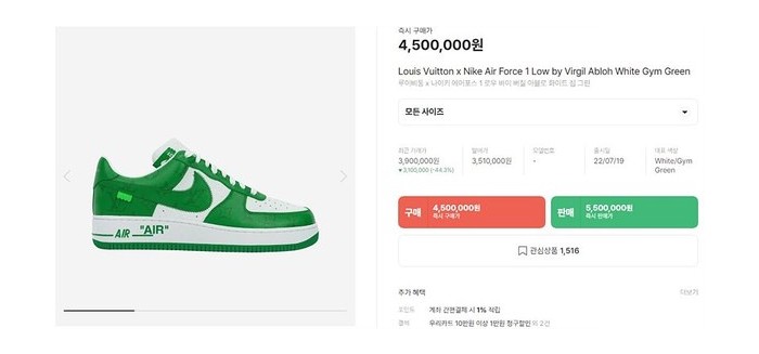 루이비통 X 나이키 에어포스 1 로우 바이 버질 아블로 화이트 짐 그린 [리셀가 500만원대]