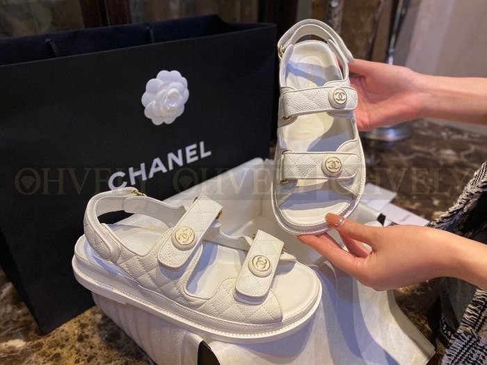 샤넬 CC 버튼 벨크로 샌들 캐비어